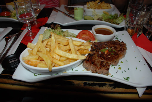 對這家餐廳最深刻的印象,嗯,應該是超大聲的音樂、吧台旁邊的分貝量測器、還有不時跟背景音樂一起哼唱的店員,感覺真歡樂啊...至於餐點,嗯,我們大都點很安全的牛排,結果果然很安全^^; 隨餐還附上一種酸酸甜甜的沾醬,沾牛排還是薯條都還滿好吃的