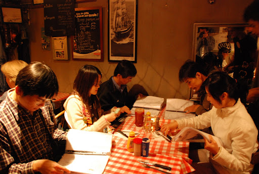 眾人聚精會神研究法文菜單.....(結果翻到後面幾頁,就有英文菜單)