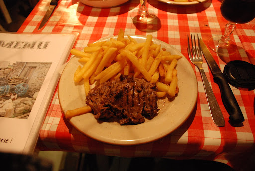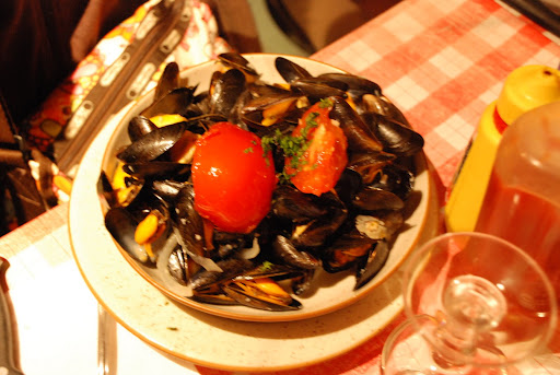 這家餐廳是在網路上看到別人的介紹,據說很便宜,所以我們決定去打打牙祭。有多便宜,套餐只要8.5歐,有主菜一盤,紅/白酒一杯,飯後咖啡一杯 o_O 套餐主菜有三種,不過我們只點了兩種:淡菜一大盤+薯條,還有牛排+薯條,第三種沒點,所以不知道是什麼:p